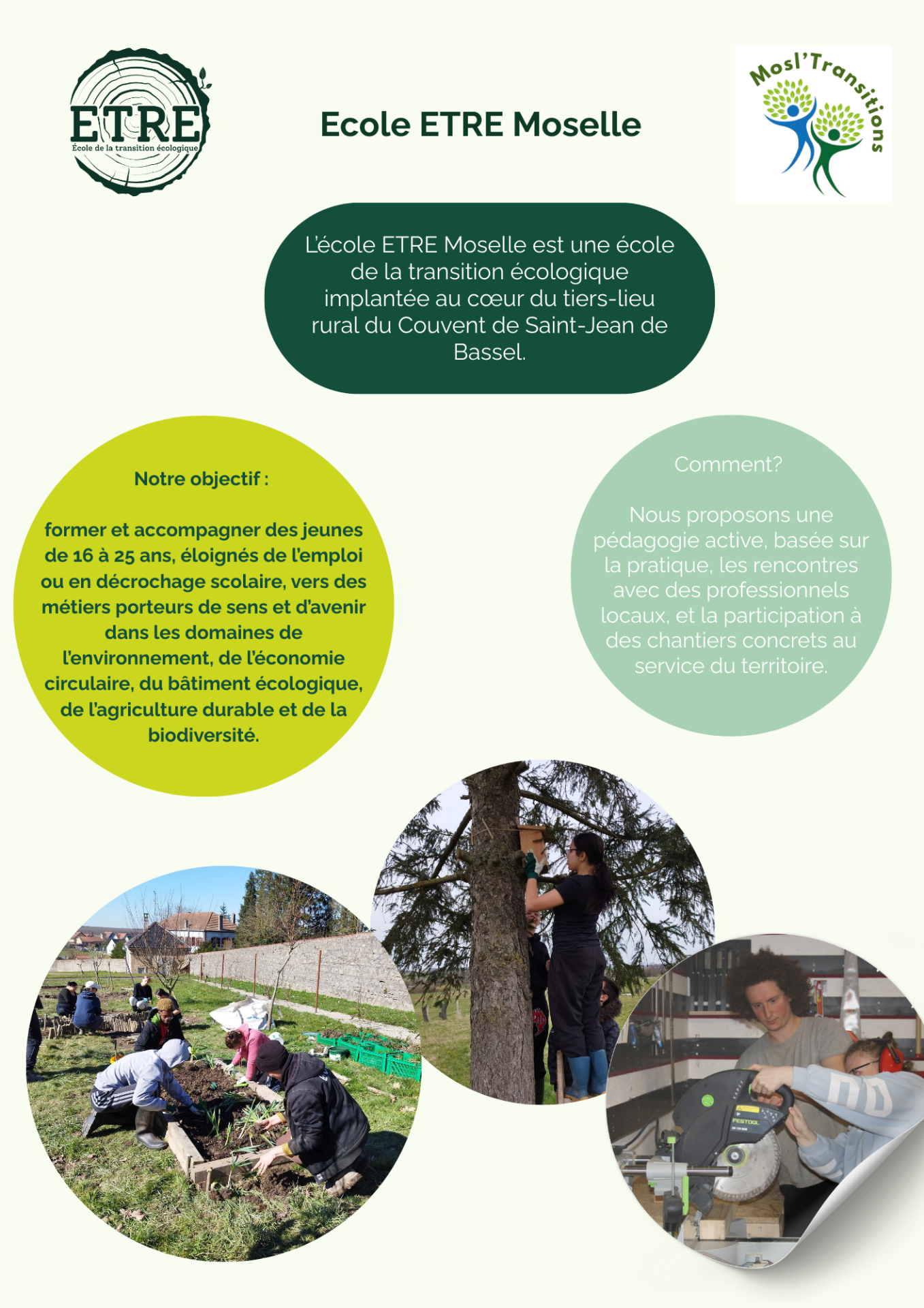 Ce deuxième palier permet d’équiper l’école ETRE Moselle : achat d’outillage, d’équipements de protection individuelle (EPI) et de matières premières pour les chantiers. Des conditions concrètes, utiles et sécurisées pour apprendre par la pratique.
